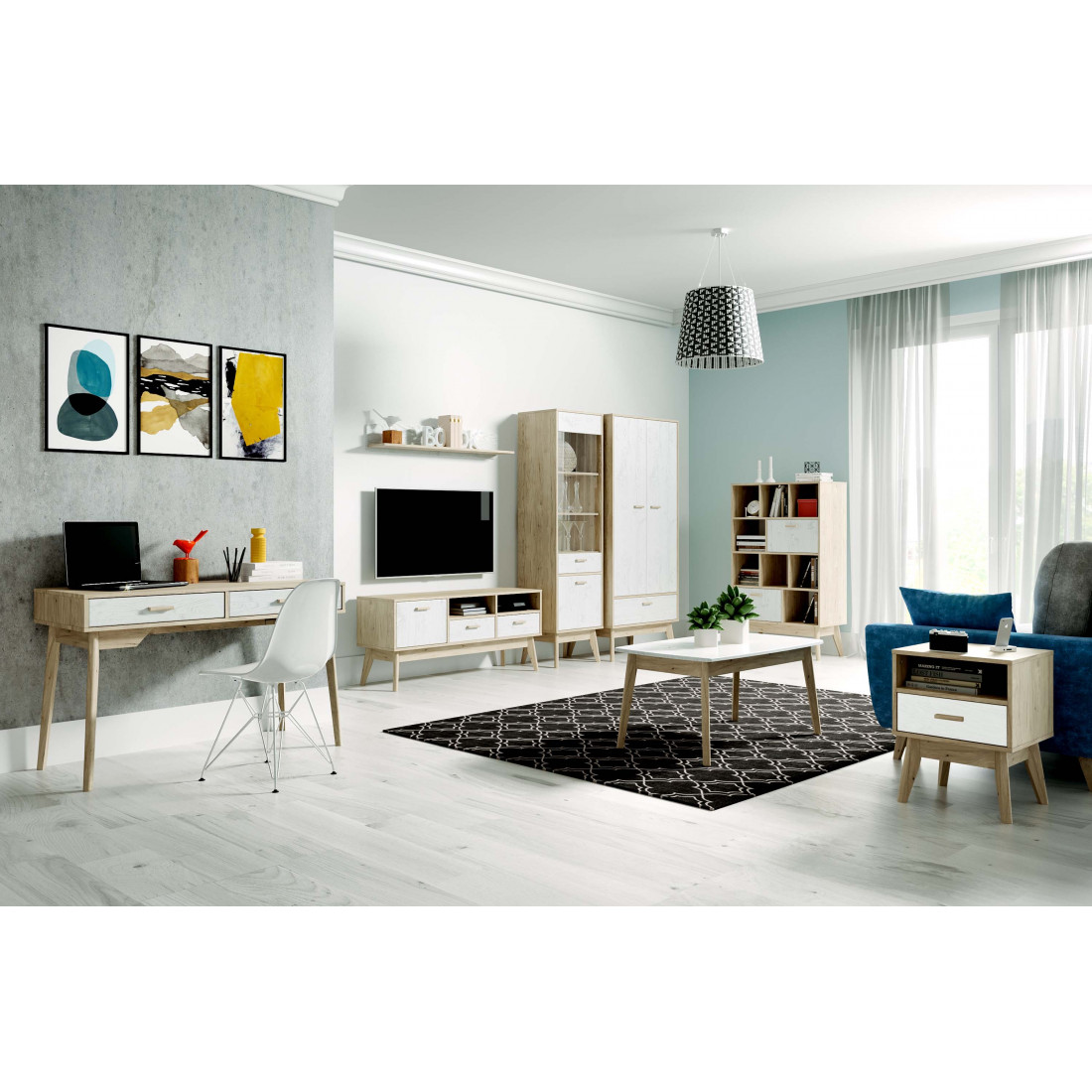 Ультратрендовая гостиная Калгари от Мебельград, выполненная в светлых тонах с элементами сдержанного стиля 60-х - высокие ножки, выраженная деревянная текстура натурального дуба, четкие формы. Вся мебель очень мобильная, компактная, вызывает чуство легкости и свободного пространства, при этом она функциональна.