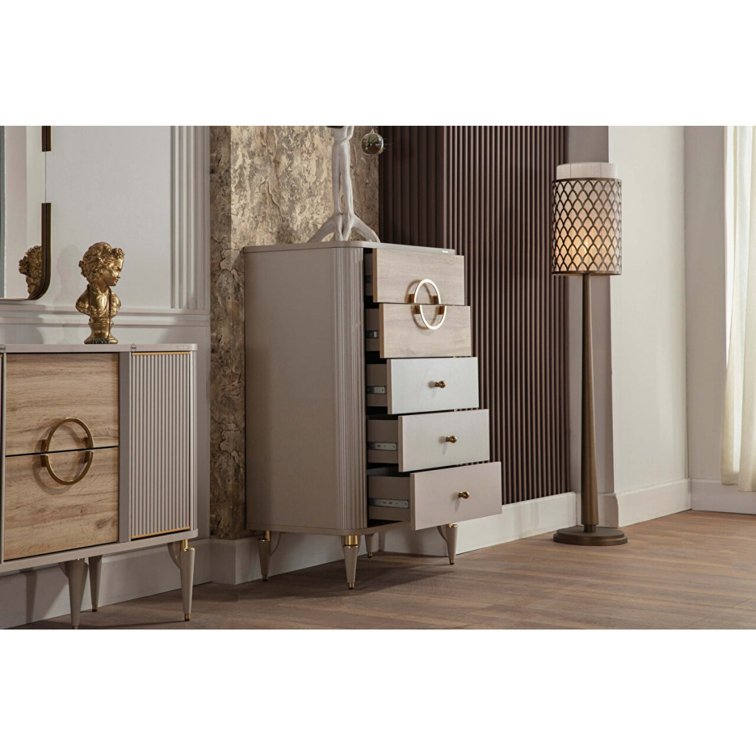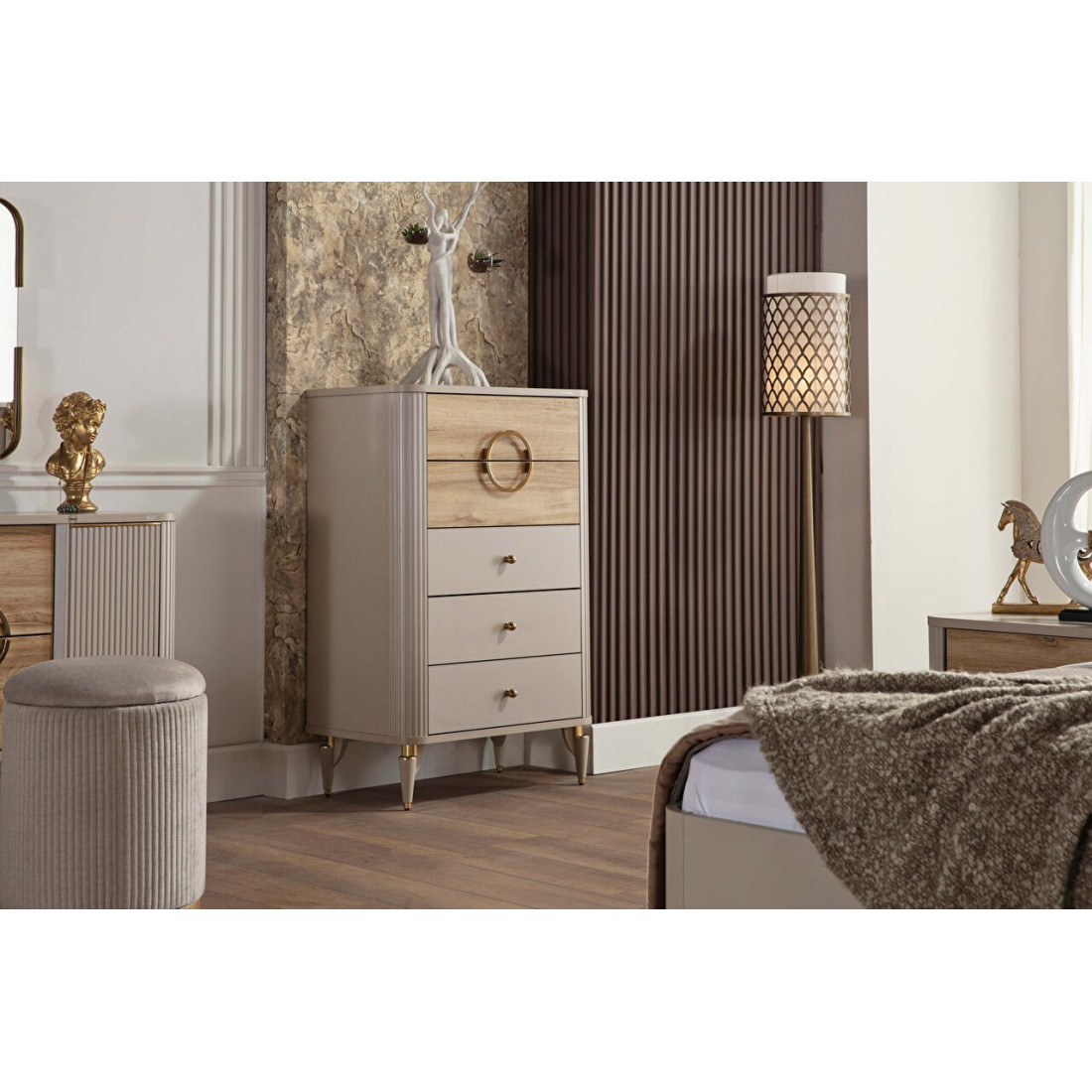 Высокий комод для белья Санвито SANV-28 незаменимый атрибут в Вашей спальне. Благодаря своим небольшим габаритам, ширина 760мм, и высота 1180мм, прекрасно встанет в любоv месте интерьера. Пять вместительных ящиков для хранения вещей. Комод продолжает турецкую линейку мебели SANVITO под брендом Bellona. Отличительной особенностью этой коллекции является сочетание разных фактур покрытия фасадов. фасады ящиков в кремовом цвете и матовые древесные фасады. Украшением комода выступают оригинальные ножки с золотистой отделкой, ручки капельки и дизайнерский венец в виде большого кольца на верхних фасадах.