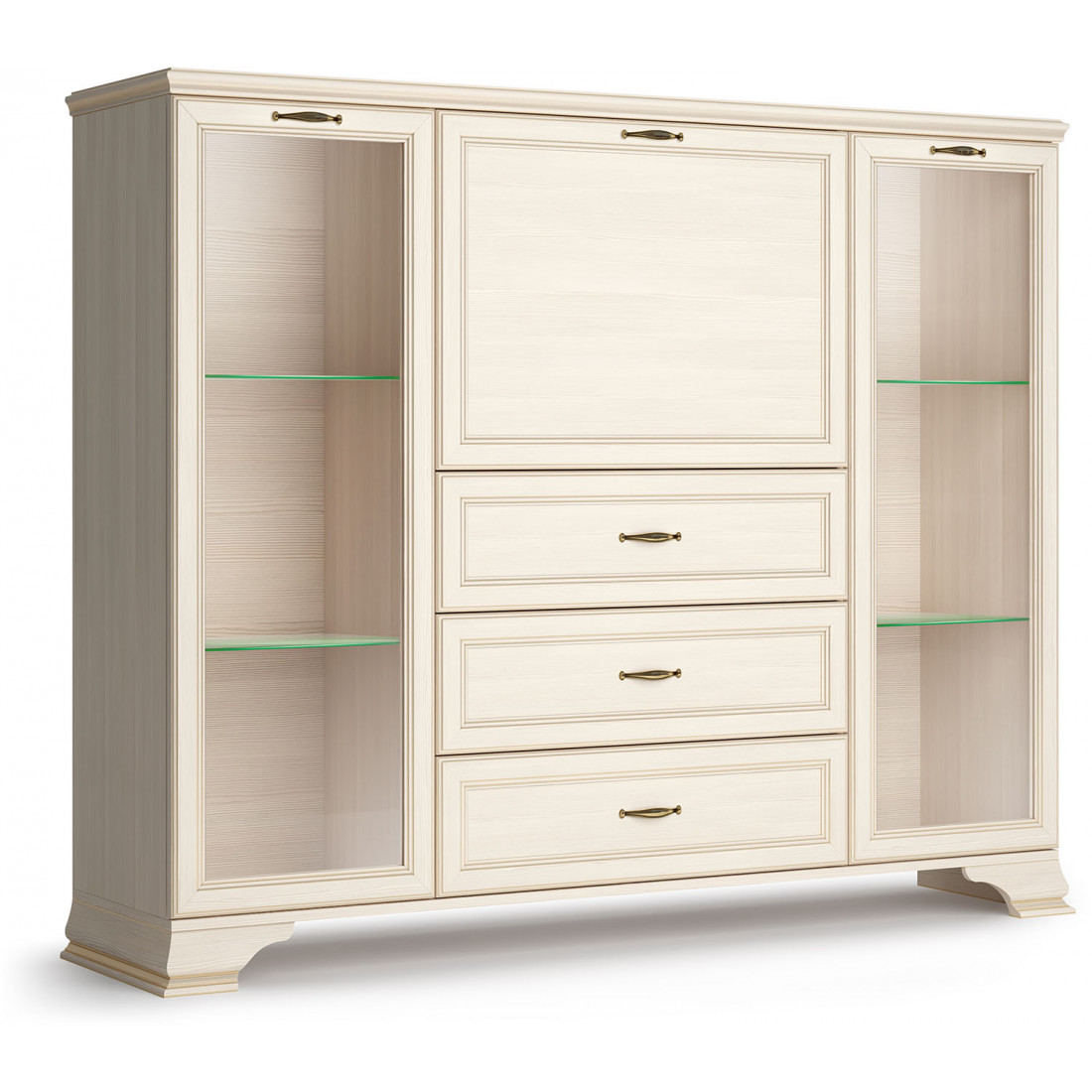 Коллекция производится в текстуре «бодега белый» с эффектом золотого патинирования. Облик «Сиены» дополняют рамочные фасады и карниз в классическом стиле, а также эффектные опоры из МДФ. Мебель комплектуются металлической лицевой фурнитурой премиум-класса в цвете «старая бронза» и надежной крепежной фурнитурой.