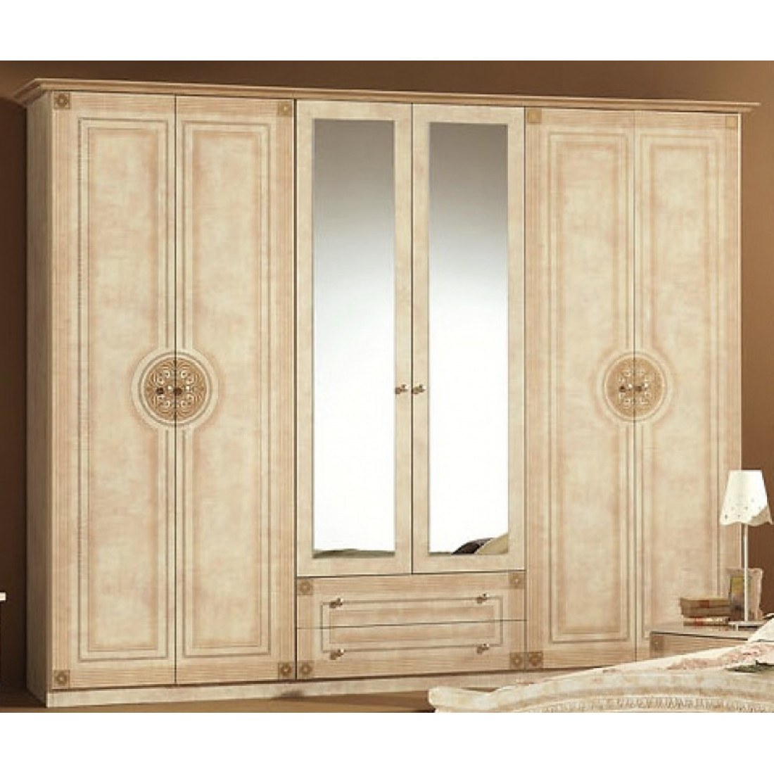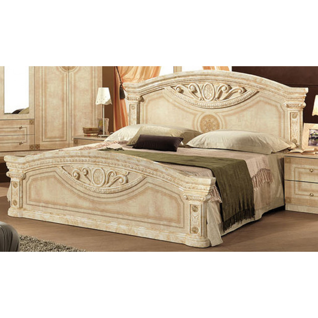 Спальня Рома (беж) композиция 2 от Российской фабрики «ДИА мебель» выполнена в строгом, классическом стиле. Бежевый цвет в сочетании с глянцевым покрытием придает элегантность. Такая спальня поможет Вам окунуться в атмосферу роскоши и комфорта. Большой шестистворчатый шкаф поможет с пользой заполнить место. Безшумные и плавно закрывающиеся дверцы шкафа и комода помогут с легкостью забыть о шуме по утрам. Вся коллекция "Рома" предназначена только для истинных ценителей элегантного классического стиля.