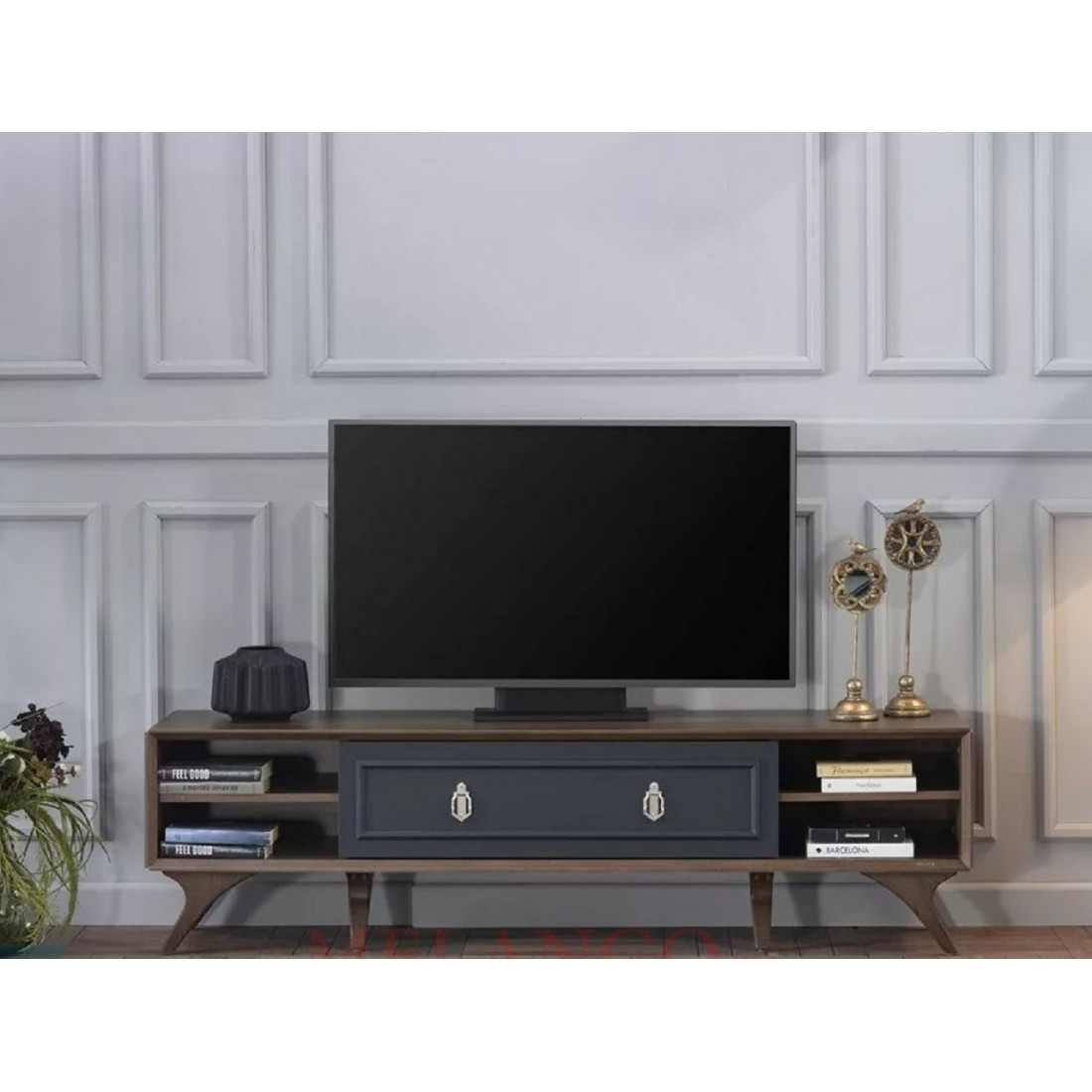 Тумба под ТВ в гостиную серии Алегро от Беллона станет прекрасным, многофункциональным дополнением интерьера гостиной. Ручки образуют единый декоративный элемент, сходясь в центре фасадов. В качестве материала для фасадов, столешницы и ножек использовался МДФ.